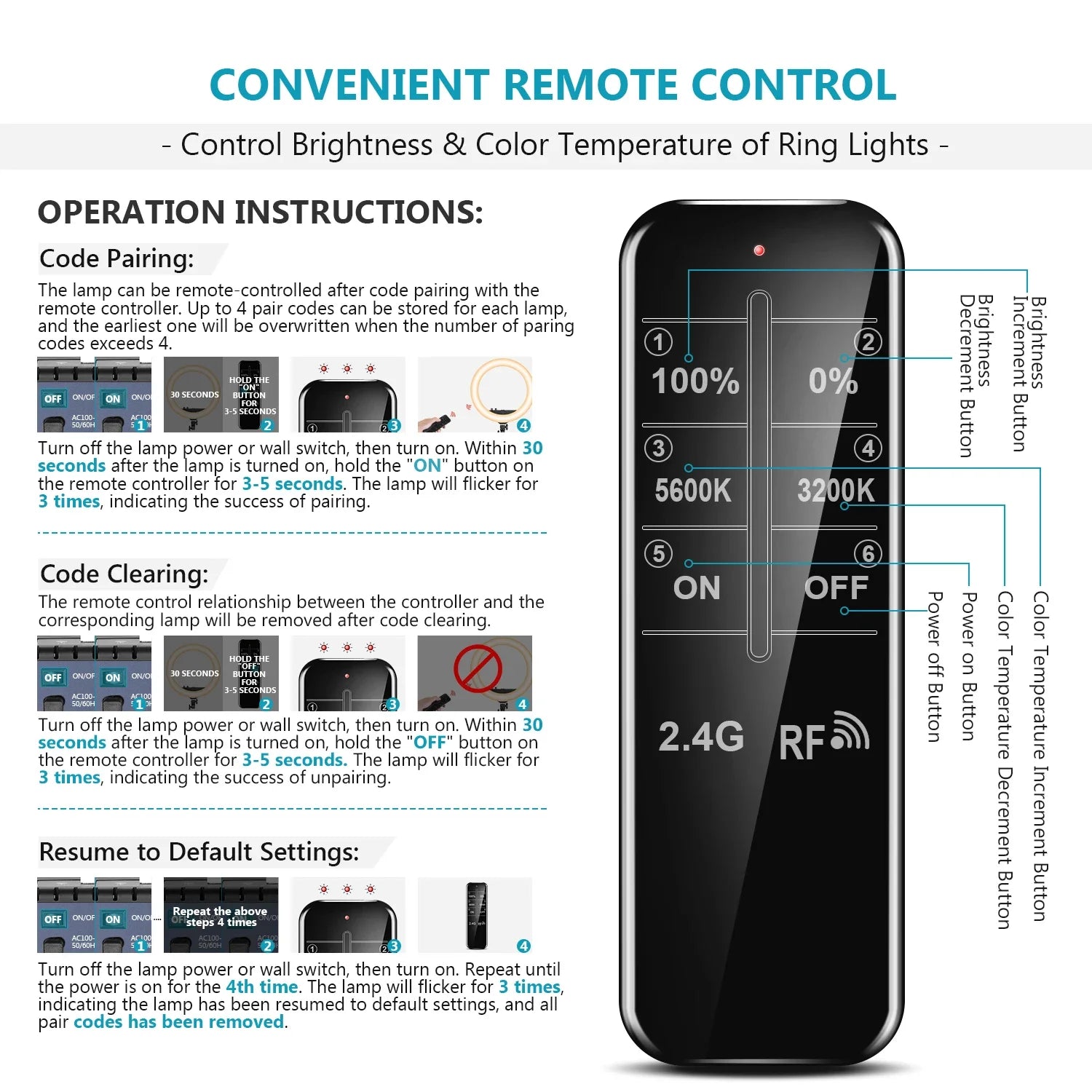 2.4G WIRELESS REMOTE CONTROL AND SELFIE REMOTE: 2.4G Wireless remote control for convenient access to brightness and color temperature settings; Selfie remote makes you selfie more easily