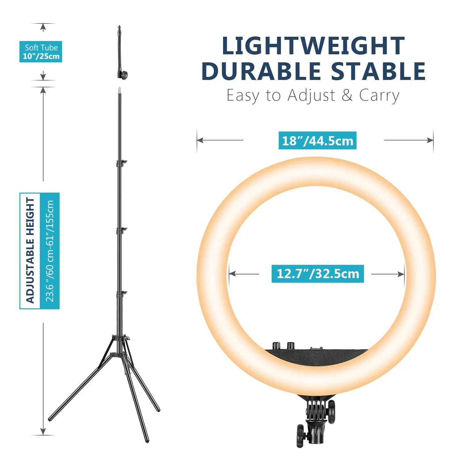 LIGHT STAND & SOFT TUBE: 61inches light stand is constructed from aluminum alloy, giving it exceptional strength; Its solid locking capabilities ensure the safety of your lighting equipment when in use. The flexible soft tube design makes the ring light adjusted at any angle