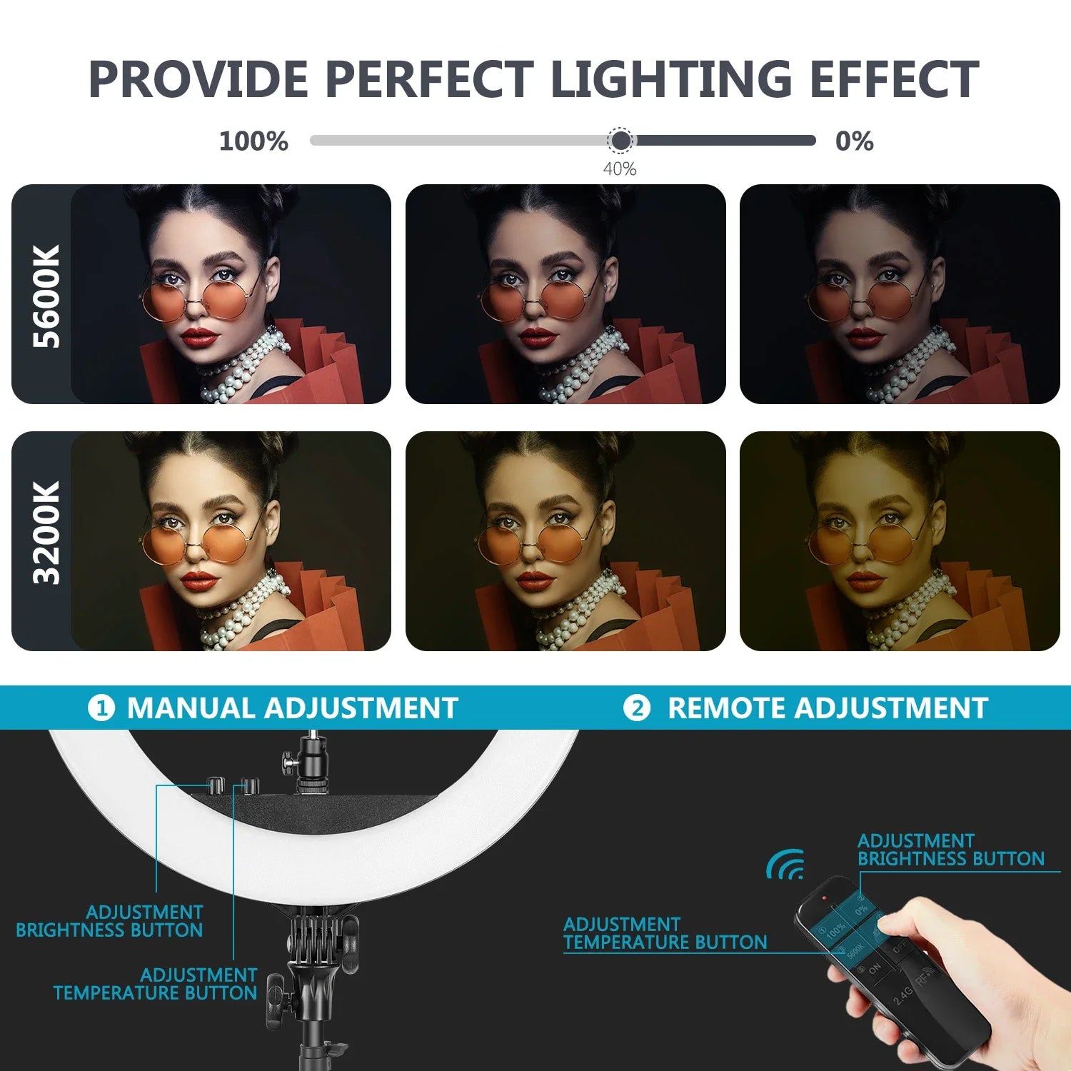 BI-COLORS & DIMMABLE: Bi-color temperature ring light variables from a Warm 3200K to a White 5500K freely without orange color filter. Brightness can be changed from 0% to 100%. Achieve cold white light or warm light to hide blemishes and change skin tones quickly and easily. LED SMD design and 512 pieces beads offer more light for your camera photography, vlogging, live streaming, Facebook Live, Youtube, beauty makeup, salons, selfies and videos; Designed with excellent heat dissipation